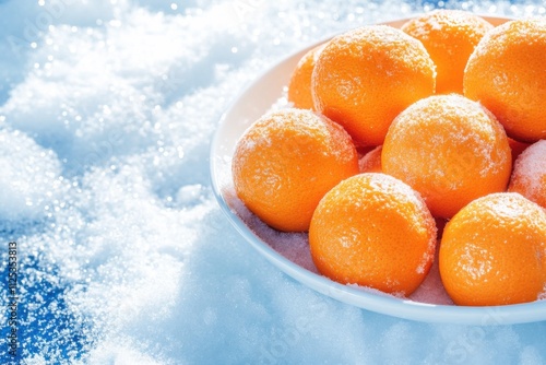 Vibrant tangerines beautifully arranged in a white bowl contrasting against soft, fresh snow on a winter day