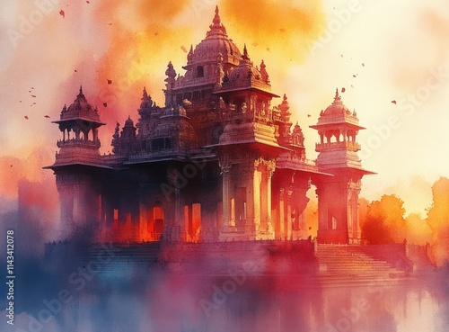 Vibrant Temple Scene for Rath Yatra Celebration in Traditional Indian Watercolor Style