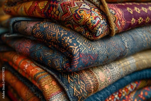 Vibrant Textiles: A Colorful Stack of Intricately Designed Fabrics