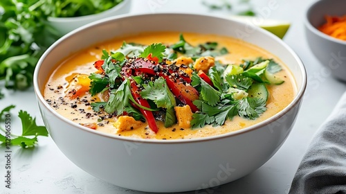 Vibrant Thai Coconut Soup in Minimalist Studio Setting with Clean Background