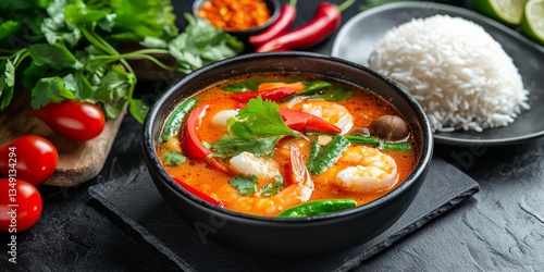 Vibrant Thai Shrimp Soup with Fresh Ingredients and Side of Rice