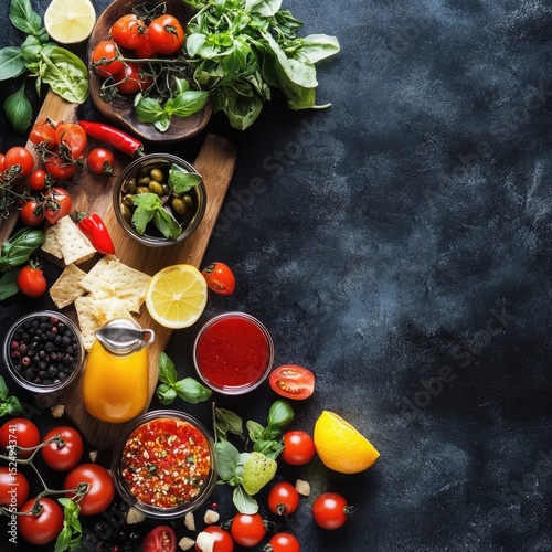 Vibrant tomatoes, herbs, cheese, and sauces arranged artistically on a dark background, leaving ample space for text or design elements