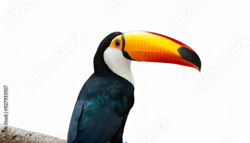 Vibrant toucan perched on a branch, a splash of color against a white background.