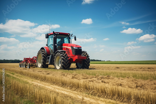 vibrant tractor working in vast field, cultivating land under bright blue sky with fluffy clouds. agricultural life concept