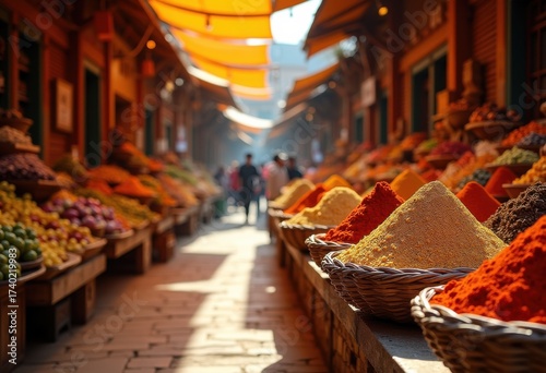 Vibrant Traditional Marketplace Burst with Colorful Spices Textures and Bounty of Fresh Produce Atmosphere