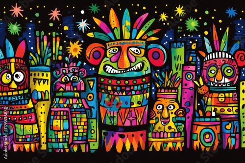 Vibrant Tribal Masks and Festive Night Scene