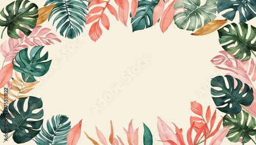 Vibrant tropical border illustration with watercolor-style leaves in green, pink, and orange, including monstera, palm, and fern, symmetrical design with light beige center, generative ai