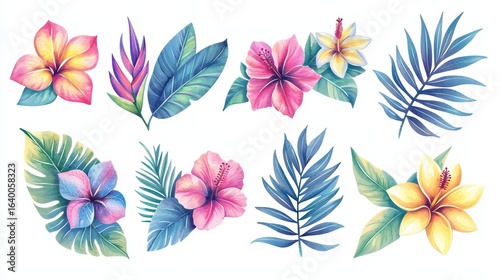 Vibrant Tropical Flower and Leaf Illustrations for Creative Projects