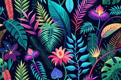 Vibrant Tropical Foliage and Flowers on Dark Background Colorful Exotic Plants Botanical Illustration Jungle Pattern Nature Inspired Design Modern Art Decorative Element Wallpaper Design