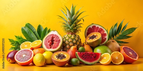 Vibrant Tropical Fruit Still Life with Pineapple and Leaves, Yellow Background, Summer Fruit , tropical fruit