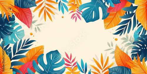 Vibrant Tropical Leaf Border Illustration. The leaves create a frame around a white background, perfect for adding text or other design elements. The feeling of summer, vacation, and relaxation.