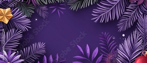 Vibrant Tropical Palm Leaves and Flowers on Dark Purple Background