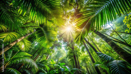 vibrant tropical rainforest canopy with sunlight filtering through leaves