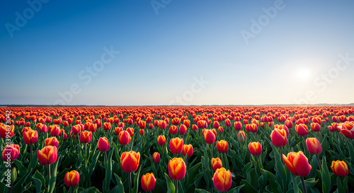 Vibrant Tulip Field Under Clear Blue Sky At Sunrise Photography