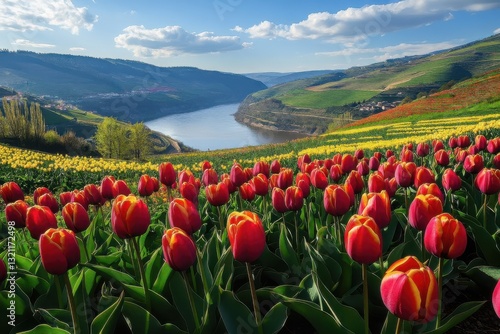 Vibrant tulip fields blooming near a river valley in springtime under a clear blue sky with rolling hills in the background