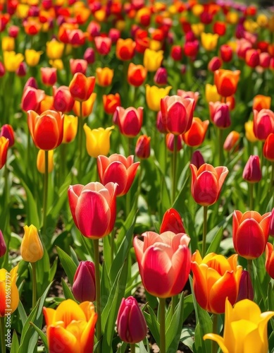 Vibrant tulips in a sun-drenched meadow, showcasing a rainbow of colors, blossom, sunny meadow, natural scenery
