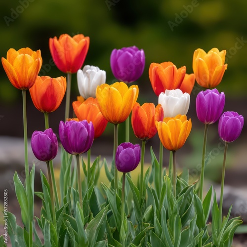 Vibrant Tulips in Varied Colors Blooming in a Sunlit Garden with Soft Background