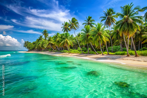 Vibrant turquoise ocean waves gently lap against the idyllic sandy shore of Capurganá, Colombia, with lush green palm trees swaying in the serene atmosphere.