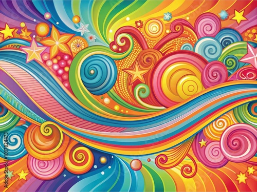 Vibrant, twirling patterns of pink, orange, yellow, green, and blue hues create a dynamic, whimsical banner with an