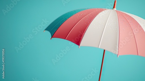 Vibrant Umbrella with Raindrops Against a Bright Background, Rain on rainbow umbrella concept.