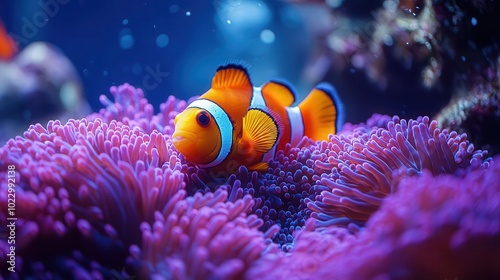 Vibrant Undersea Paradise: Clownfish in Purple Coral Sanctuary
