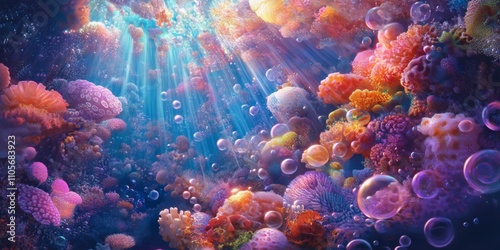Vibrant Underwater Coral Reef Fantasy Ocean Scene Bubbles Sunlight Marine Life Digital Art