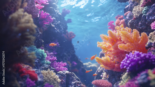 Vibrant underwater coral reef with colorful corals and fish swimming