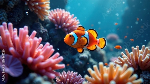 Vibrant underwater scene showcasing a single ocellaris clownfish swimming amidst a lively coral reef, exhibiting diverse coral formations and smaller fish in the background.
