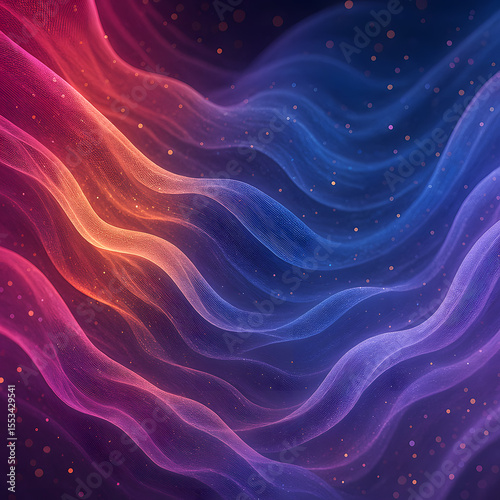 Vibrant, undulating waves of light in shades of pink, orange, purple, and blue flow across a dark background with sparkling particles