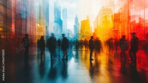 Vibrant Urban Scene with Silhouetted Figures and Colorful Reflections in a Modern Cityscape