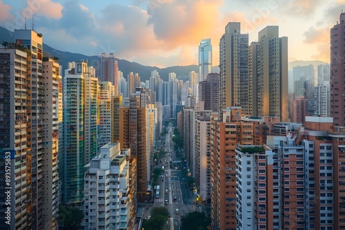 Vibrant Urban Skyline of Towering Skyscrapers and Bustling City Streets at Sunset