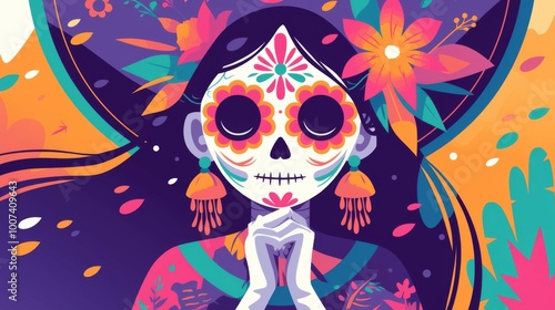 Vibrant vector illustration for Dia de Los Muertos, showcasing traditional Mexican elements such as sugar skulls, marigolds, and colorful decorations.