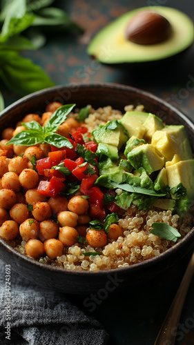 vibrant vegan bowl featuring quinoa, chickpeas, fresh avocado, and diced tomatoes, perfect for healthy meal