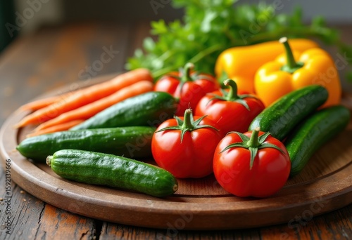 vibrant vegetable spread colorful fresh produce artfully arranged bright rustic wooden table, food, arrangement, artisan, plate, ingredients, greens, red