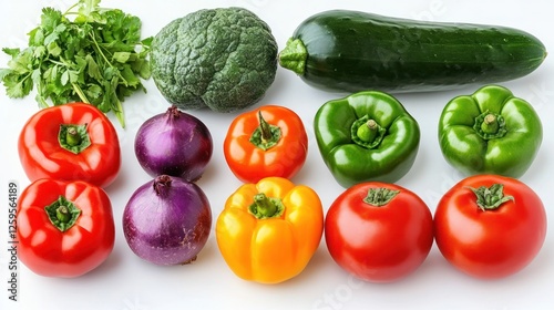 Vibrant vegetables arranged on white background, healthy food recipe concept