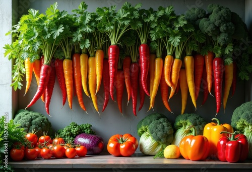 vibrant vegetables hanging colorful texture contrast raw concrete wall urban artistry, suspension, green, red, yellow, orange, healthy, organic, decor