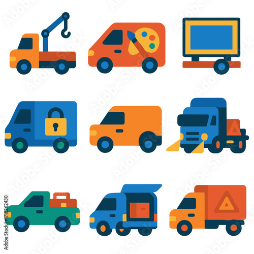 Vibrant Vehicle Icons. Flat vector icons of van, truck and lorry: lorry with open top and crane, van carrying art supplies, truck