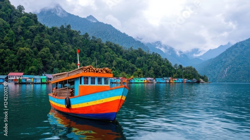 Vibrant village port nestled on the shores of a serene lake surrounded by majestic mountains Locals are busy loading timber onto colorful wooden boats