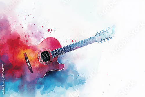 Vibrant watercolor guitar with intricate details and colorful splashes isolated design on white background