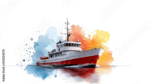 Vibrant Watercolor Illustration of a Fishing Boat Sailing Through Calm Waters with Splashes of Colorful Paint