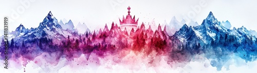 Vibrant Watercolor Mountain Landscape with Crown Design in Gradient Colors