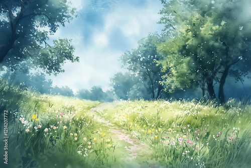 Vibrant watercolor painting depicting a serene spring meadow with lush greenery and flowers