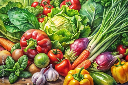 Vibrant Watercolor Painting of Fresh Vegetables & Greens - Stock Photo