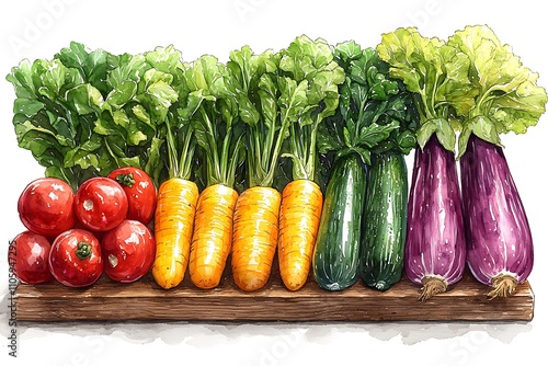 Vibrant Watercolor Painting of Fresh Vegetables on Rustic Wooden Board.