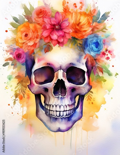 Vibrant watercolor painting of Skull with flower crown symbolizes life and death in day of the dead celebration