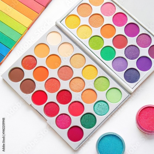 Vibrant watercolor palette with assorted colors and shiny finishes displayed on a white background