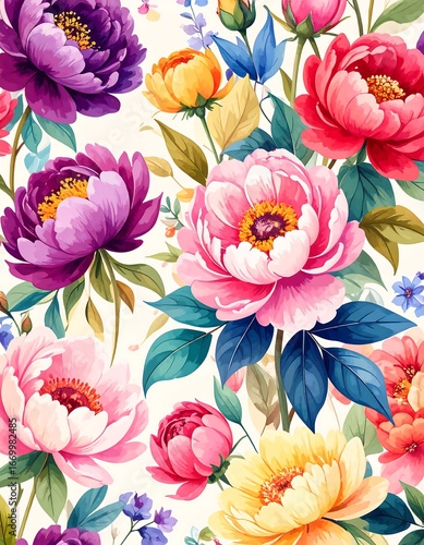 Vibrant watercolor-style floral pattern featuring large peonies and smaller blossoms
