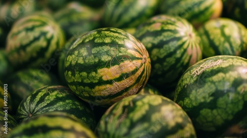 Vibrant Watermelons Piled Together in a Sunny Market on a Warm Summer Day. Generative AI