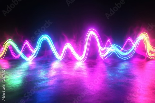 Vibrant wave of colorful lights reflecting in a sleek surface at nighttime