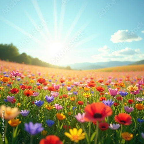 vibrant wildflower fields under clear blue sky floral bliss colorful nature landscape petals sunshine serenity, plant, meadow, blossom, garden, spring, scenery, view